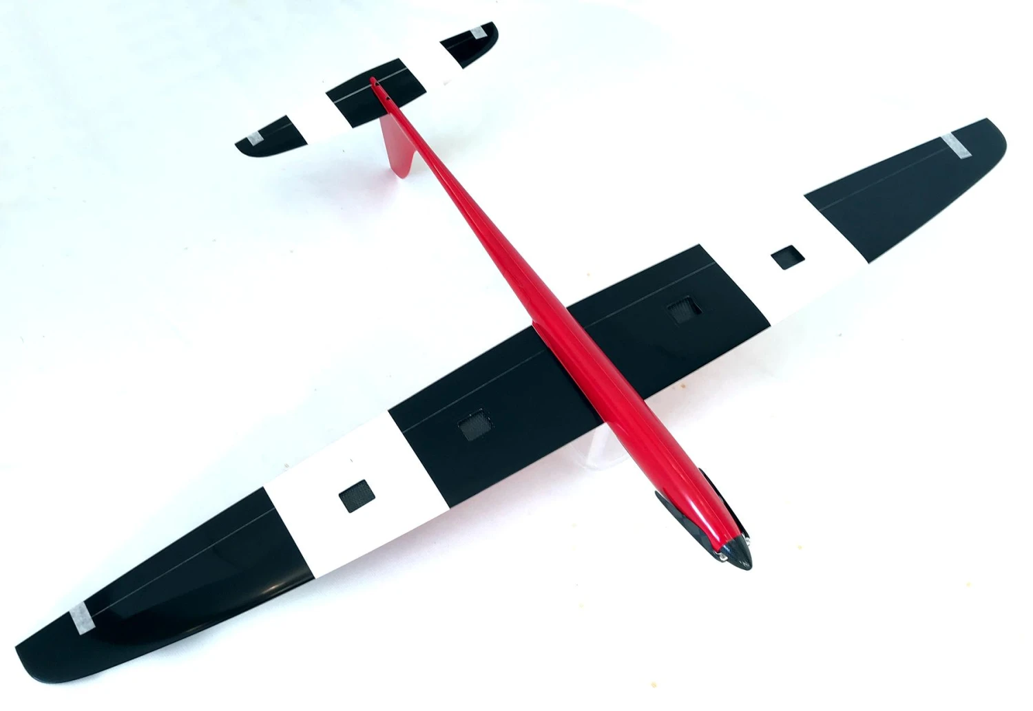 The two piece wing is available in glass and carbon layups. The glass version has a fair amount of carbon and is very strong. The full carbon version is about 50g heavier and is extremely strong and rigid and will be ideal for high power setups. The wings are kept in place with a very substantial carbon joiner. The tailplane is removable making the model very easy to store and transport. The electric fuselage is glass with carbon reinforcement and is wider than the slope racer version, allowing a substantial motor and battery to be installed. The large canopy hatch gives great access to the front, making for a very easy powertrain installation and quick battery changes. The elevator servo is under a hatch in its own pocket molded into the fuselage, just to the rear of the wing trailing edge. This makes for a very short elevator control run and also leaves the front fuselage free for the electrics.